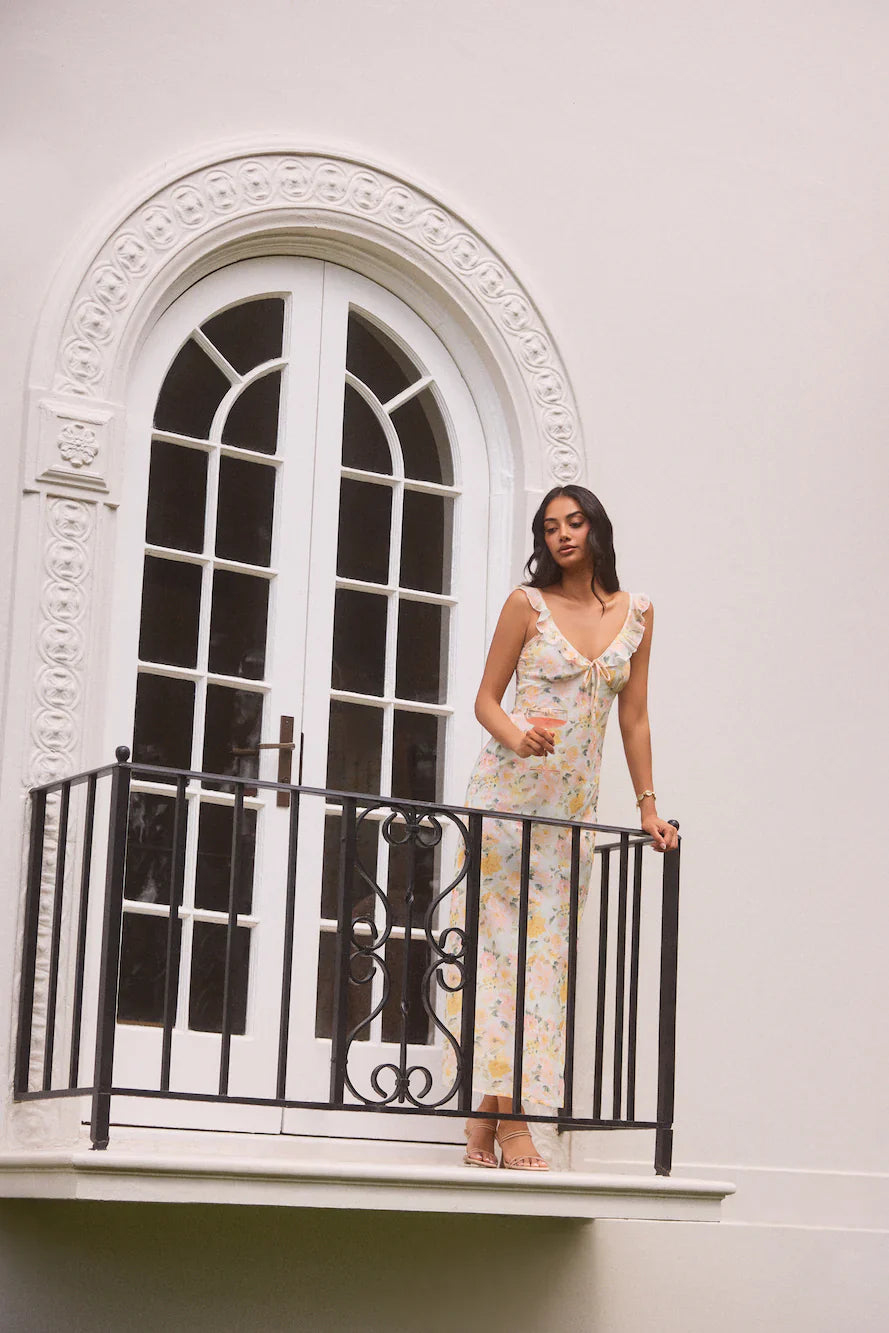 The Dear Delilah Maxi Dress is the perfect romantic piece for dates under the sun. With a delicate floral print and carefully placed frill details, this maxi dress was made for falling in love. Style with mules, gold jewellery, and curled hair for an effortless elegant, romantic look.