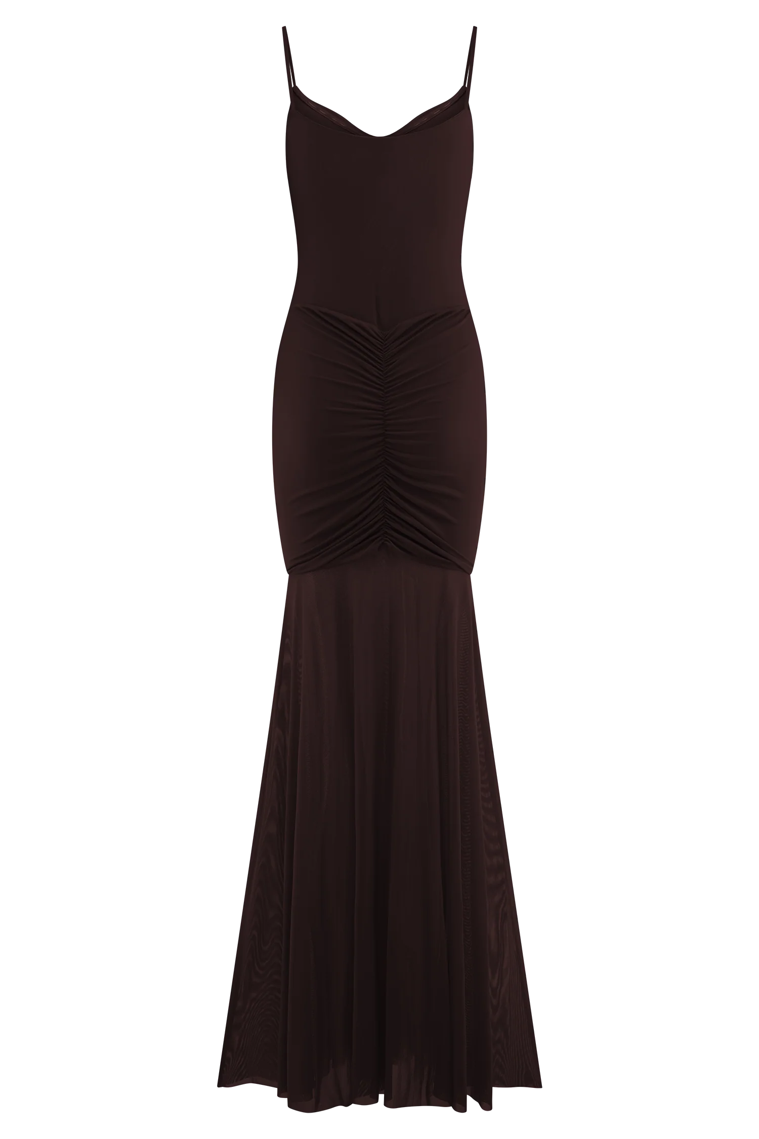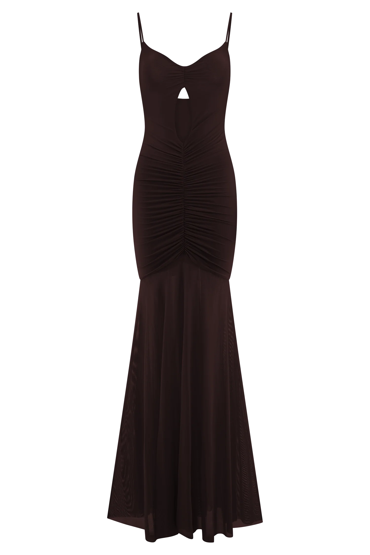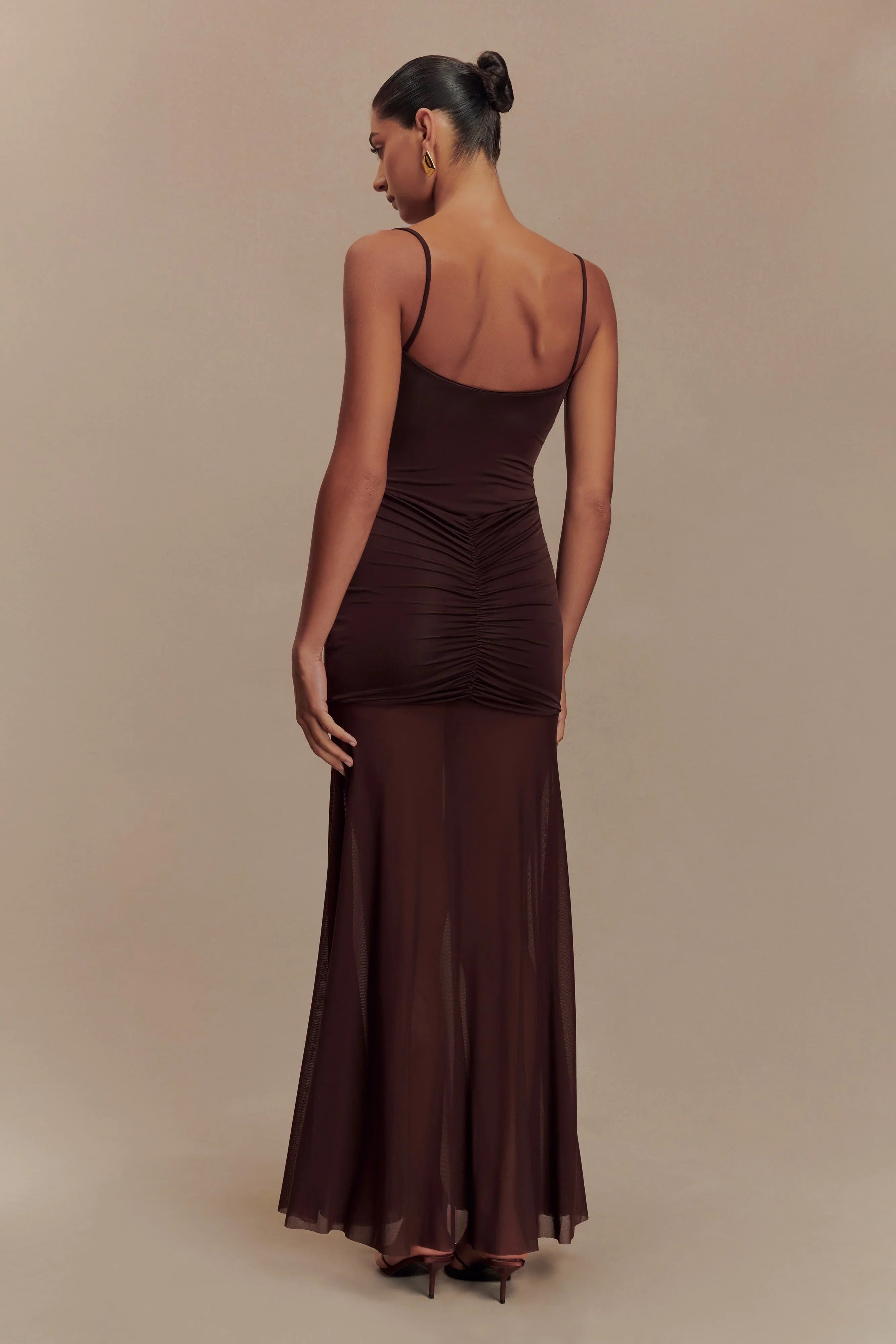 The DELANEY Slinky and Mesh Maxi Dress is the perfect balance of sultry elegance and effortless movement. Featuring a ruched bust detail and a daring front keyhole, this dress flatters the silhouette while adding a touch of intrigue. The jersey bodice offers a smooth, contoured fit, while the gathered front and back skirt details create soft draping for a feminine finish. The sheer mesh lower skirt adds fluidity and drama, beautifully complementing the adjustable straps for a customised fit. Designed in a maxi length, this dress is your go-to for events that call for modern sophistication with a hint of allure.