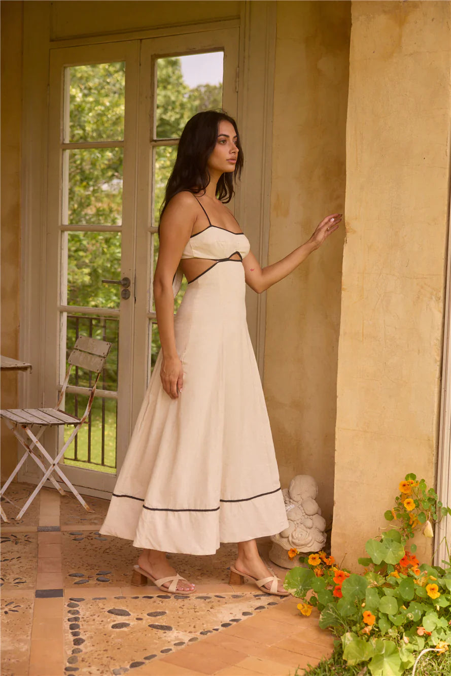The Floating Orchid Maxi Dress in white is a show-stopping choice for any occasion, combining elegance with a touch of modern flair. Featuring a bralette-style bust and a gracefully flowing skirt, this dress creates a beautifully flattering silhouette that moves with you. The black outlining adds a striking contrast to the crisp white fabric, giving this maxi dress a unique and eye-catching edge. Perfect for everything from garden parties to evening events, the Floating Orchid Maxi Dress can be effortlessly styled up with heels and jewelry or down with simple flats for a more relaxed look.