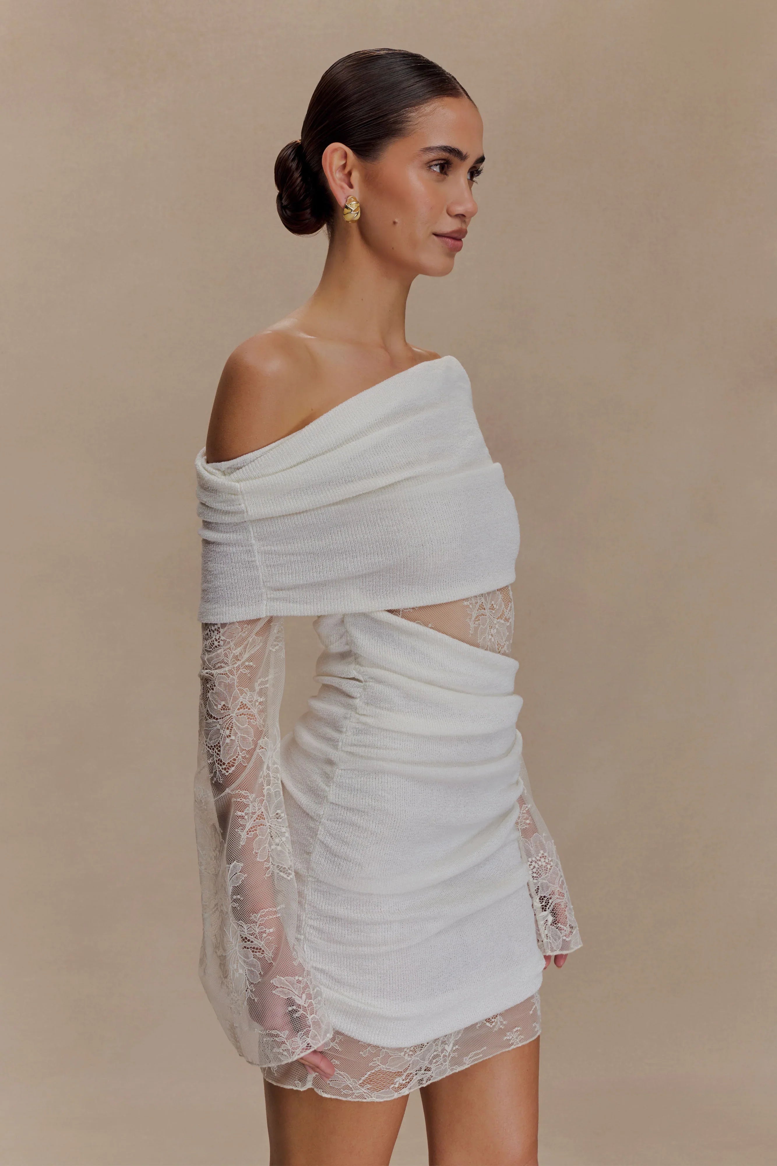 The LUXIE Lace Knit Mini Dress blends delicate detail with directional design. Featuring an asymmetrical neckline, the long lace sleeves and bodice offer a semi-sheer contrast to the soft knit overlay that wraps the bust and skirt. Designed in a mini length with a body-skimming fit, this dress is equal parts sultry and sophisticated—perfect for after-dark occasions and statement evenings.