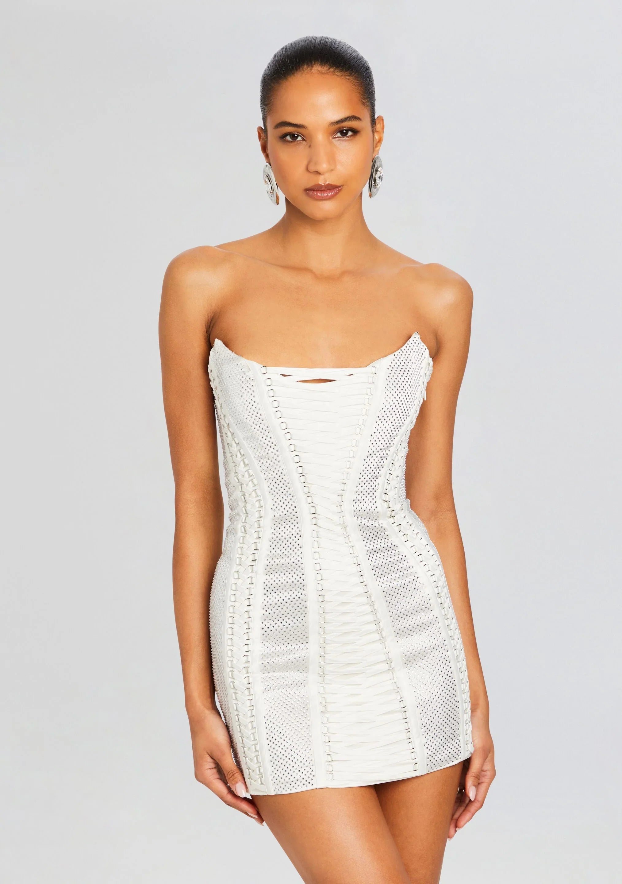 Make a glamorous entrance in our Mirielle Dress, featuring a chic strapless design that's perfect for turning heads at any event. Embrace luxury and sophistication with this statement piece that exudes effortless elegance. This mini dress is adorned with exquisite embellishments that catch the light and command attention. The strapless neckline adds a touch of allure, while the figure-flattering silhouette ensures you'll feel confident and beautiful all night long. Perfect for cocktail parties, date nights, or any special occasion, this dress is guaranteed to make a lasting impression. Shown here in White.