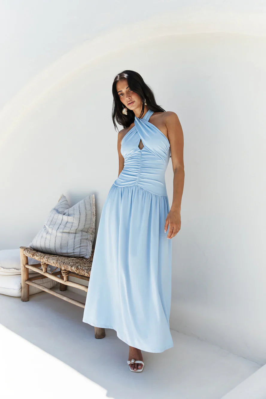 The Mocha Moments Maxi Dress in Blue, is a showstopper in every sense. This slight blue maxi features a chic halter neckline with an elegant crossover design, beautifully complemented by a daring cut-out center.