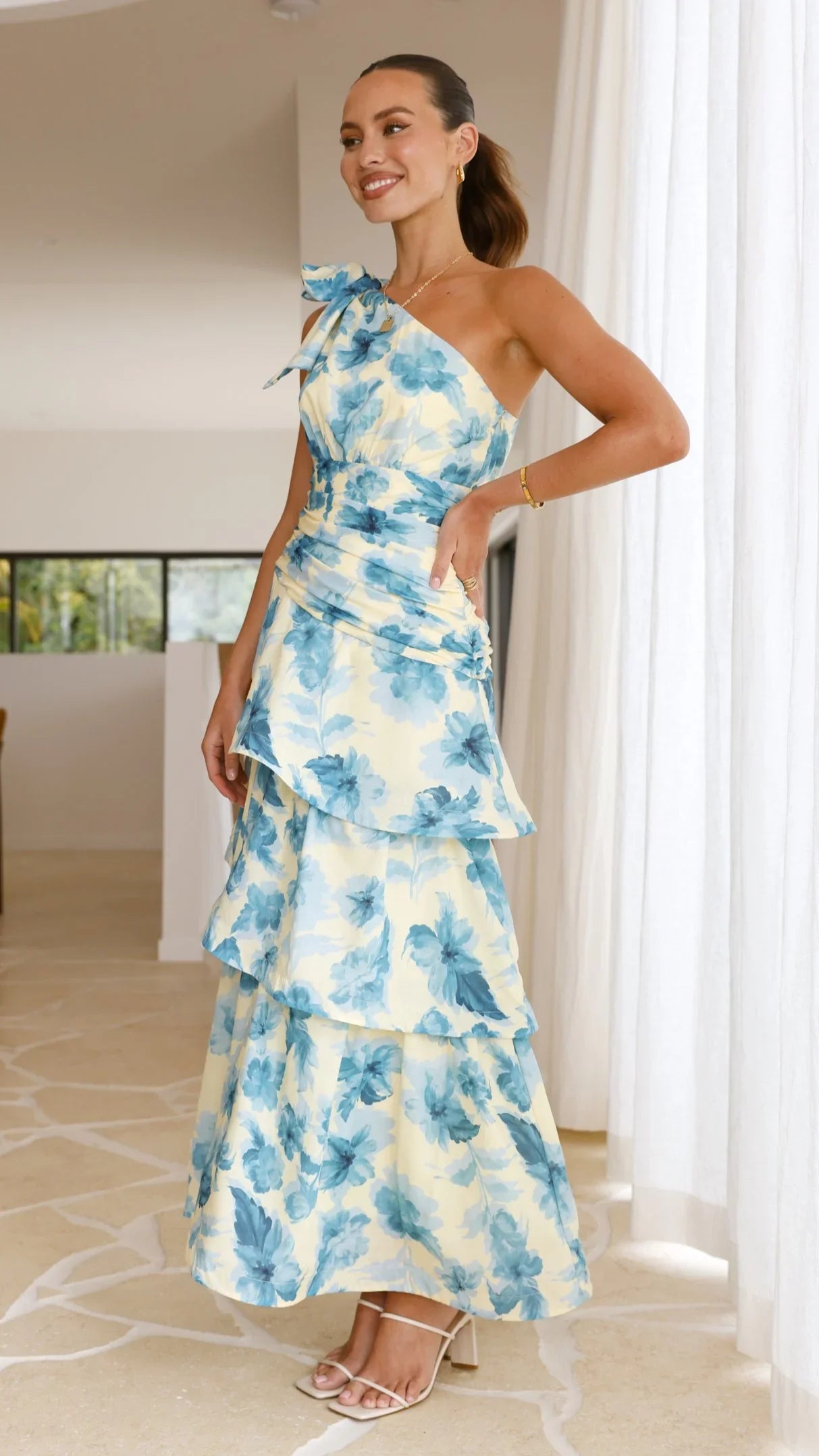 This maxi dress features a one-shoulder silhouette with elegant side ruching on the bodice and a tiered skirt. It includes an invisible side zipper for a seamless look, netting at the inner hem to enhance shape, and a smooth lining for comfort.