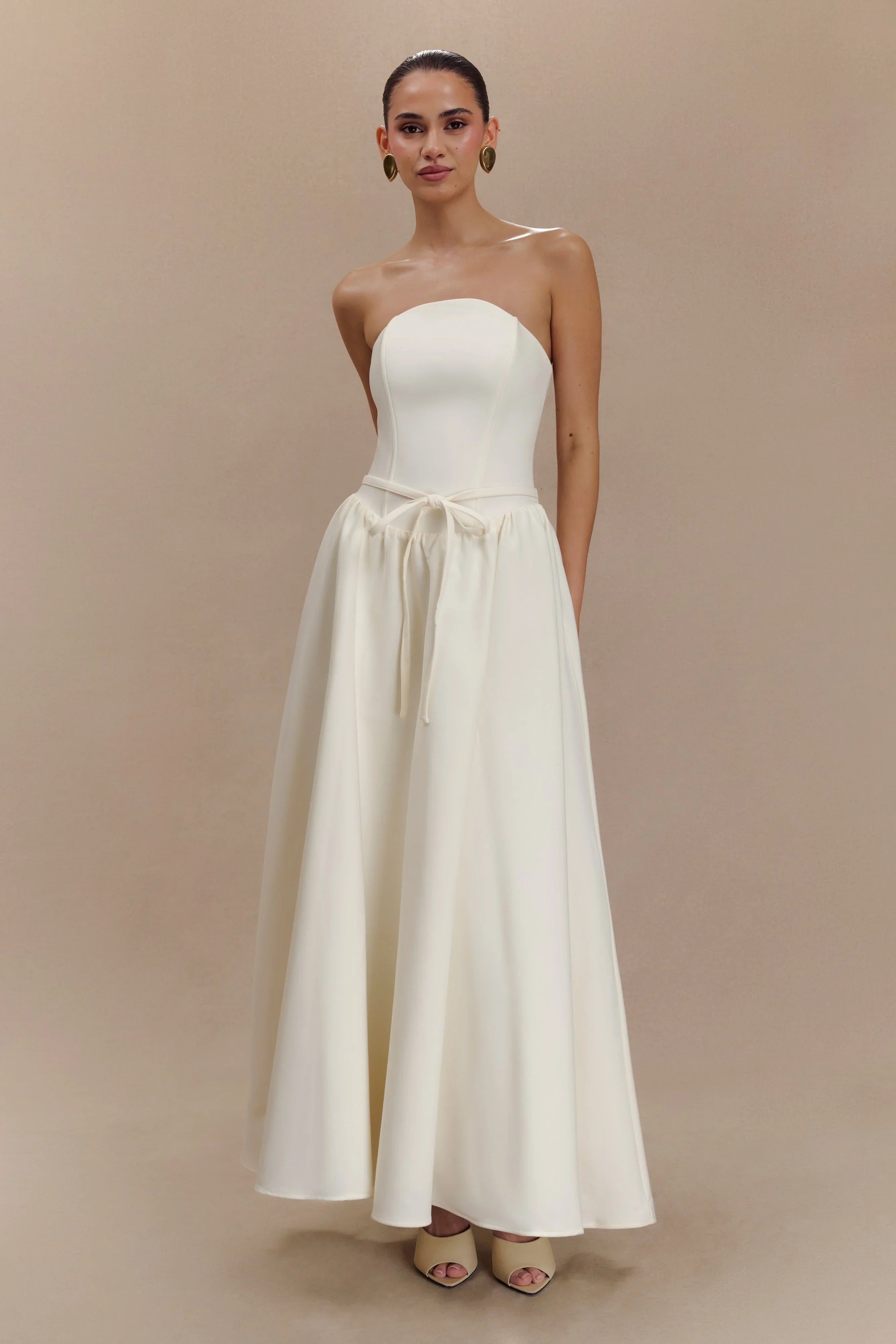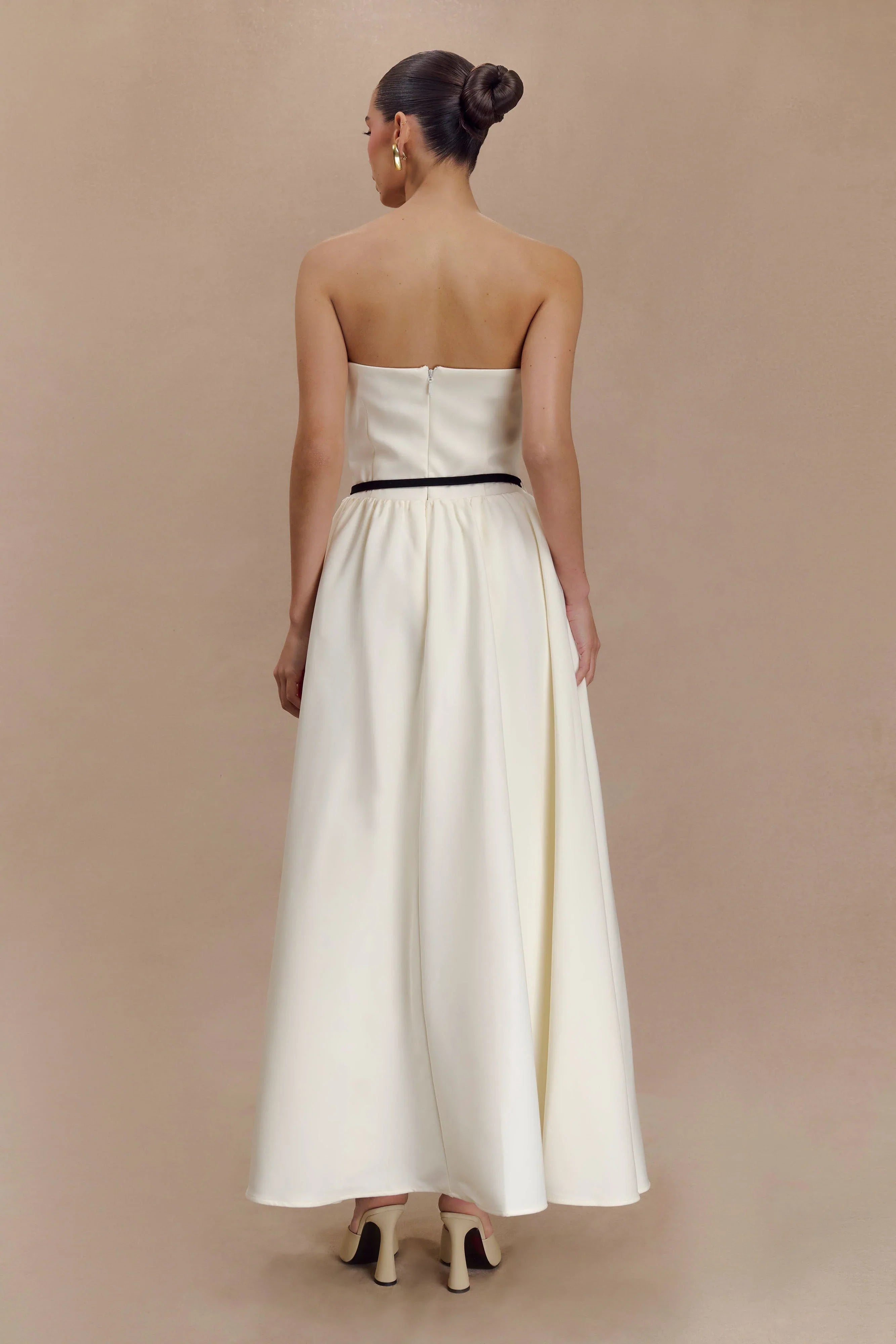 Introducing the PENNY Strapless Contrast Midi Dress, a stunning fusion of elegance and modern design. This dress showcases a flattering rounded front neckline and a strapless silhouette that accentuates your shoulders beautifully. The centre back zip closure provides a secure fit, while the full skirt offers volume and movement for an eye-catching silhouette. With its midi length, this dress is perfect for both daytime occasions and evening events. The accompanying waist belt beautifully cinches the waist, enhancing your natural curves and adding an extra touch of sophistication.