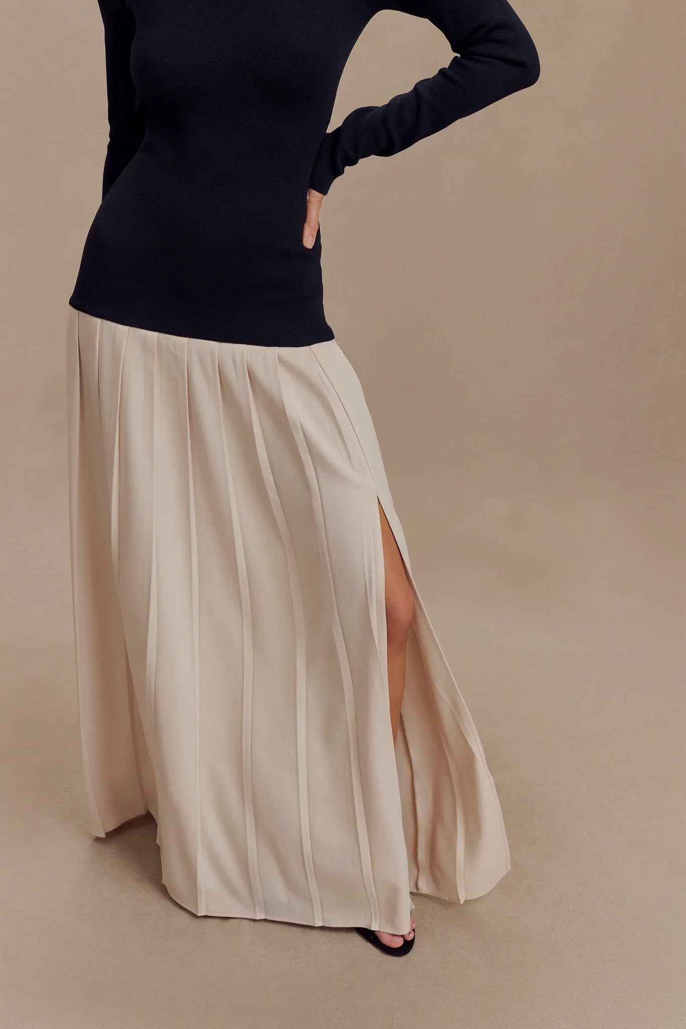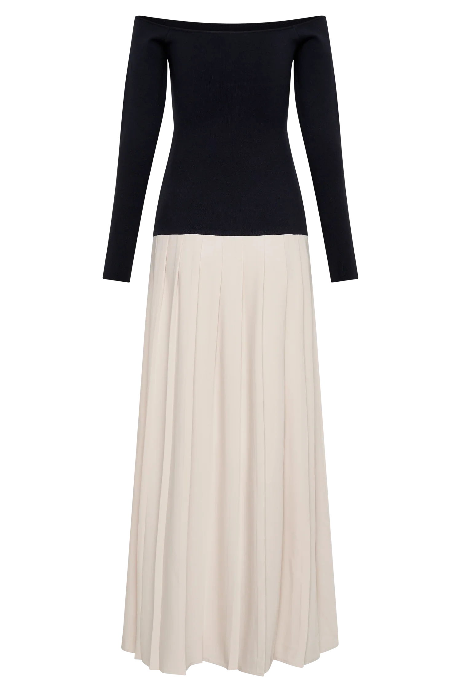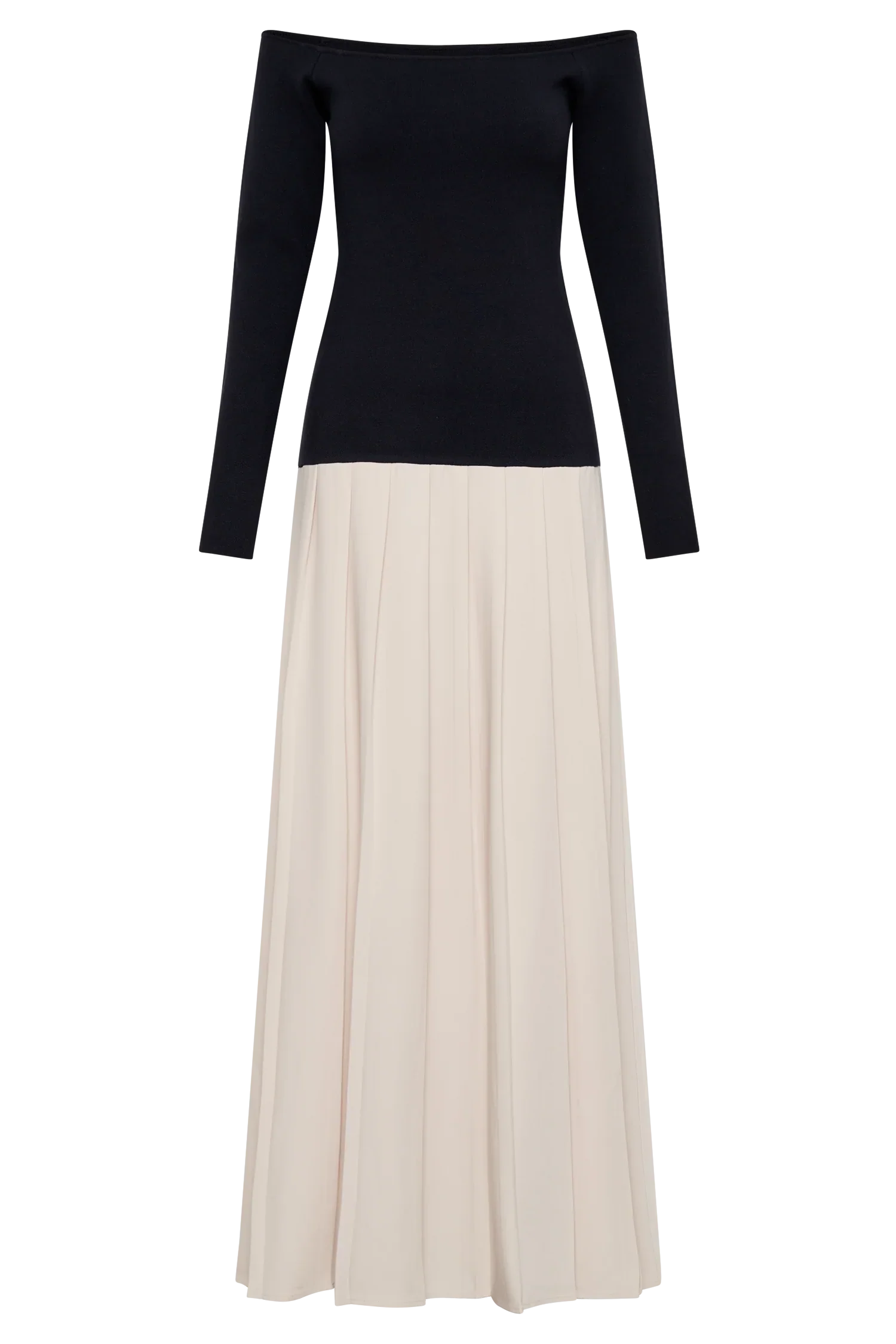 The PRESLEY Contrast Knit Off Shoulder Maxi Dress elegantly merges contemporary style with classic charm. Featuring a Bardot neckline and long sleeves, the knit upper offers a snug, bodycon fit that enhances your silhouette. The contrast between the fitted knit upper and the cotton lower skirt creates a striking visual appeal. The pleated skirt adds a touch of movement and sophistication, while the maxi length ensures a graceful, flowing look. Unlined for a lightweight feel, the Presley Dress is perfect for both daytime events and evening outings, delivering a refined and stylish statement.