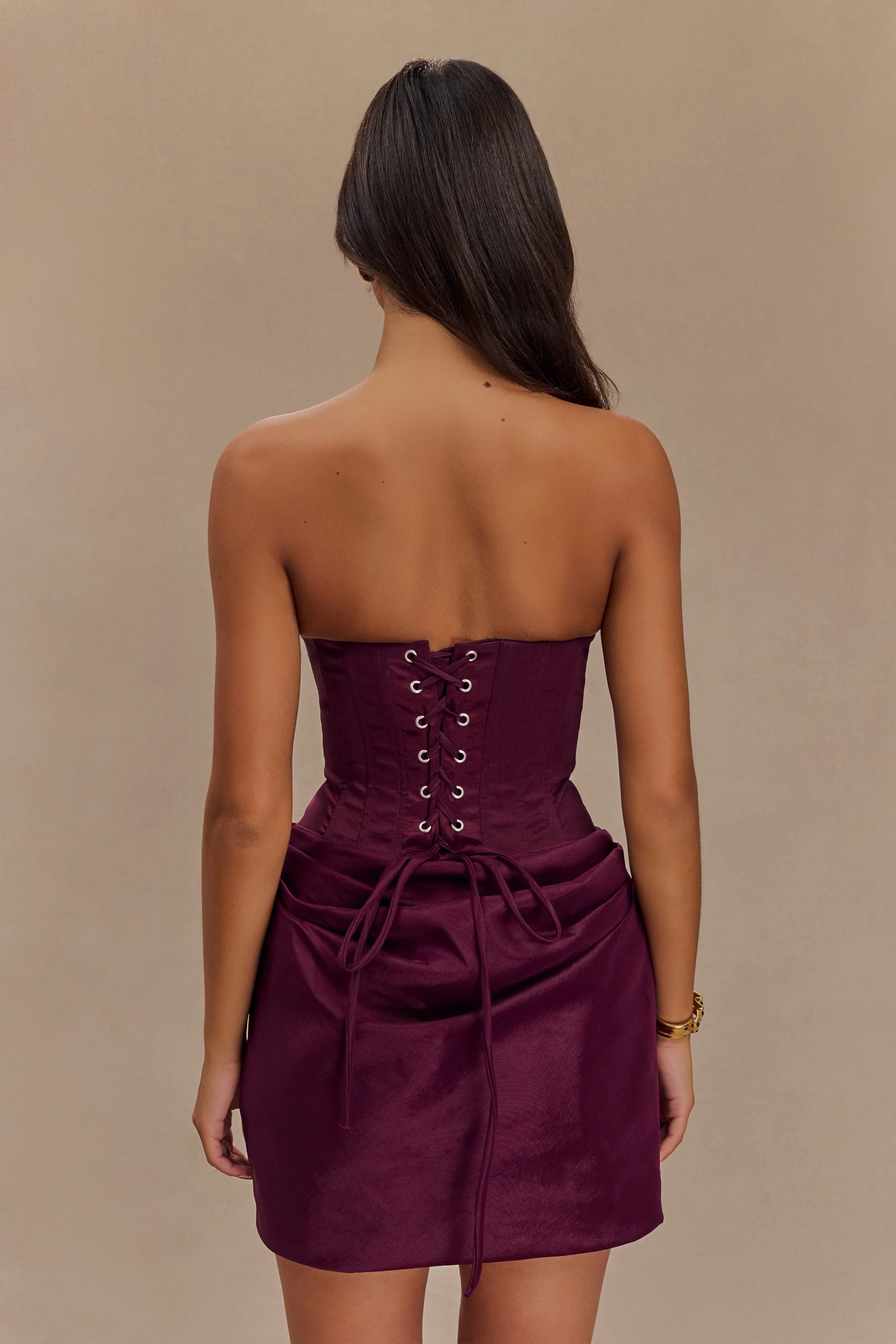The SASHA Taffeta Strapless Corset Mini Dress is a show-stopping blend of vintage glamour and modern elegance. Featuring a strapless design with a fitted, corseted bodice, this dress contours the body for a flattering, structured fit. The centre back lace-up detail allows for a customizable, secure fit, while the gathered overlay skirt adds movement and texture. Crafted from luxurious velvet fabrication, the dress exudes rich, opulent charm. Fully lined for comfort, the mini length makes it a perfect choice for any evening event where you want to make a lasting impression.