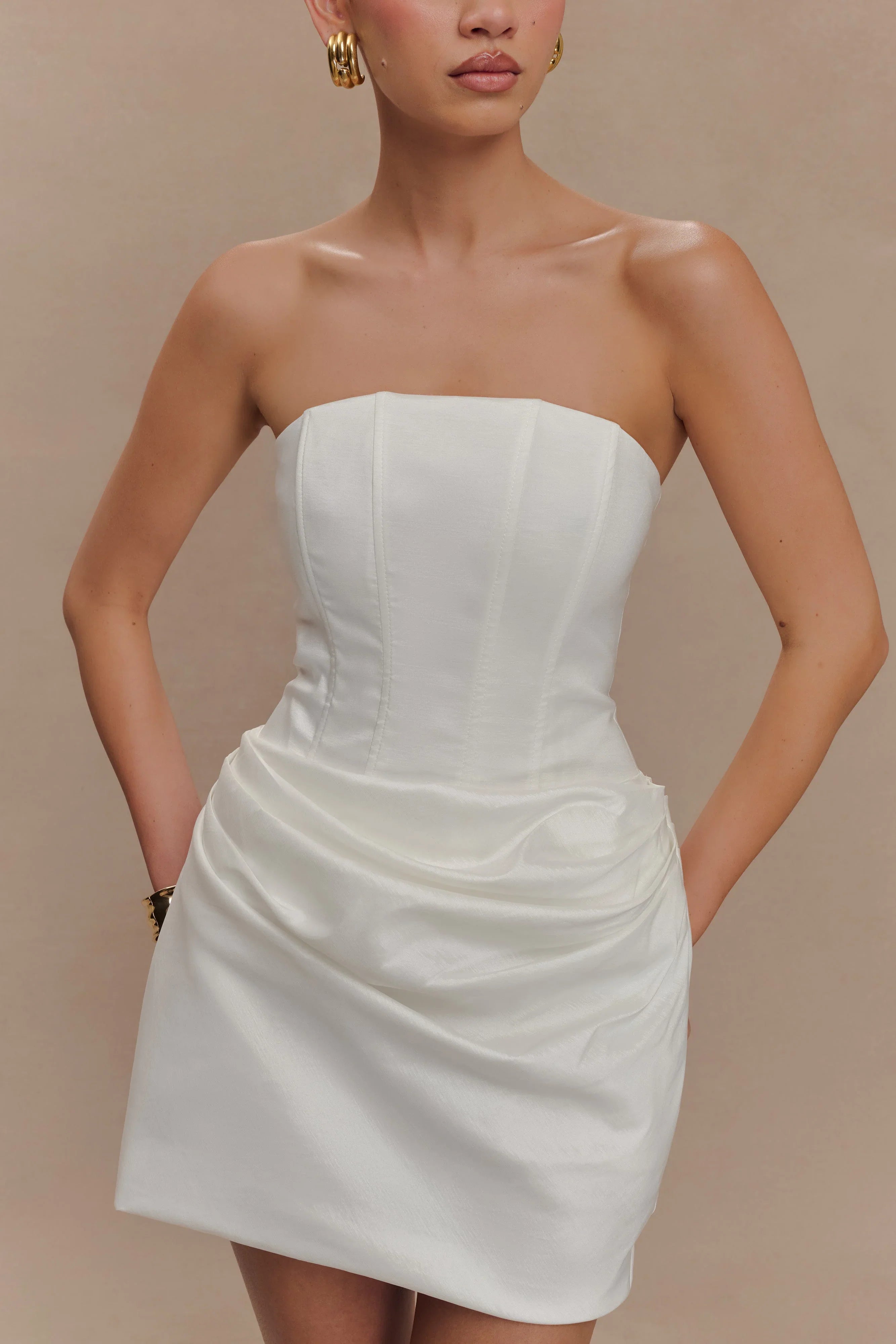 The SASHA Taffeta Strapless Corset Mini Dress is a show-stopping blend of vintage glamour and modern elegance. Featuring a strapless design with a fitted, corseted bodice, this dress contours the body for a flattering, structured fit. The centre back lace-up detail allows for a customisable, secure fit, while the gathered overlay skirt adds movement and texture. Crafted from luxurious velvet fabrication, the dress exudes rich, opulent charm. Fully lined for comfort, the mini length makes it a perfect choice for any evening event where you want to make a lasting impression.
