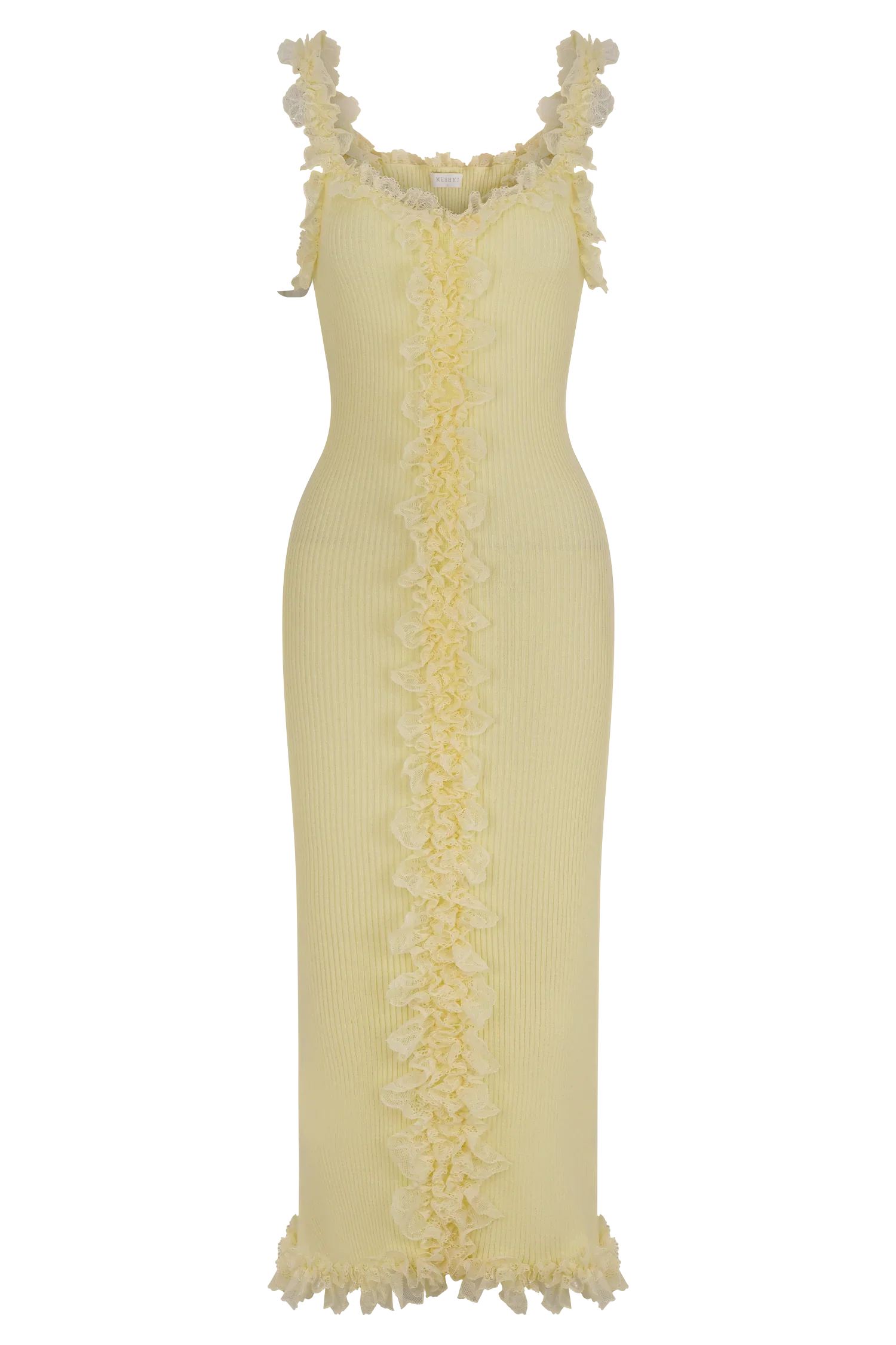 The SHAY Lace Ruffle Knit Midi Dress is a delicate fusion of femininity and modern elegance. Crafted from a soft ribbed knit, this dress features a classic round neckline and a flattering midi length for effortless sophistication. Lace ruffle straps and a scalloped lace hem add a touch of romance, while the front ruffle detail creates soft movement and texture. Designed unlined for a lightweight feel, the SHAY dress is perfect for occasions that call for understated charm with a graceful edge.