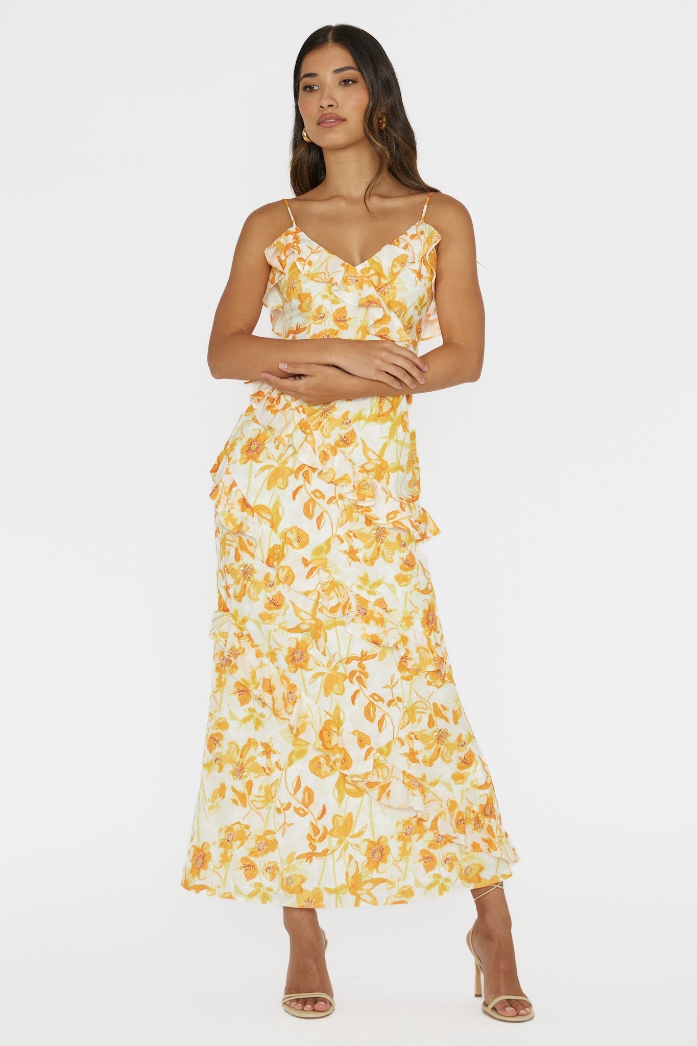 Make heads turn in our pretty Silvana dress. Featuring a pretty, floral print and a girly frill trim, it's perfect for a dinner date with your girls or a special event. Team it with kitten heels and a saddle bag for a look we are loving.