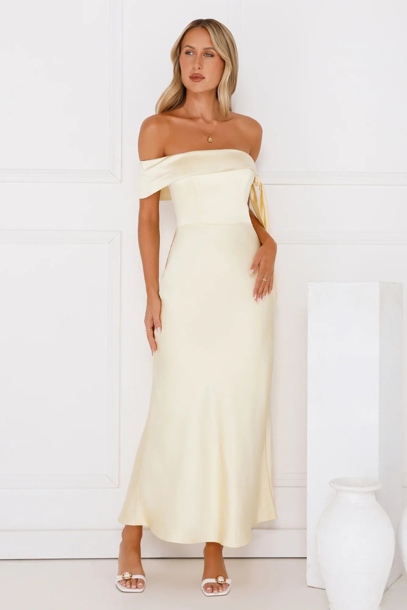 Make your entrance with The Hype Off Shoulder Satin Midi Dress. This silky satin dress features a gorgeous flowy skirt and an off-the-shoulder neckline tied to one side. Style with heels for all the likes.