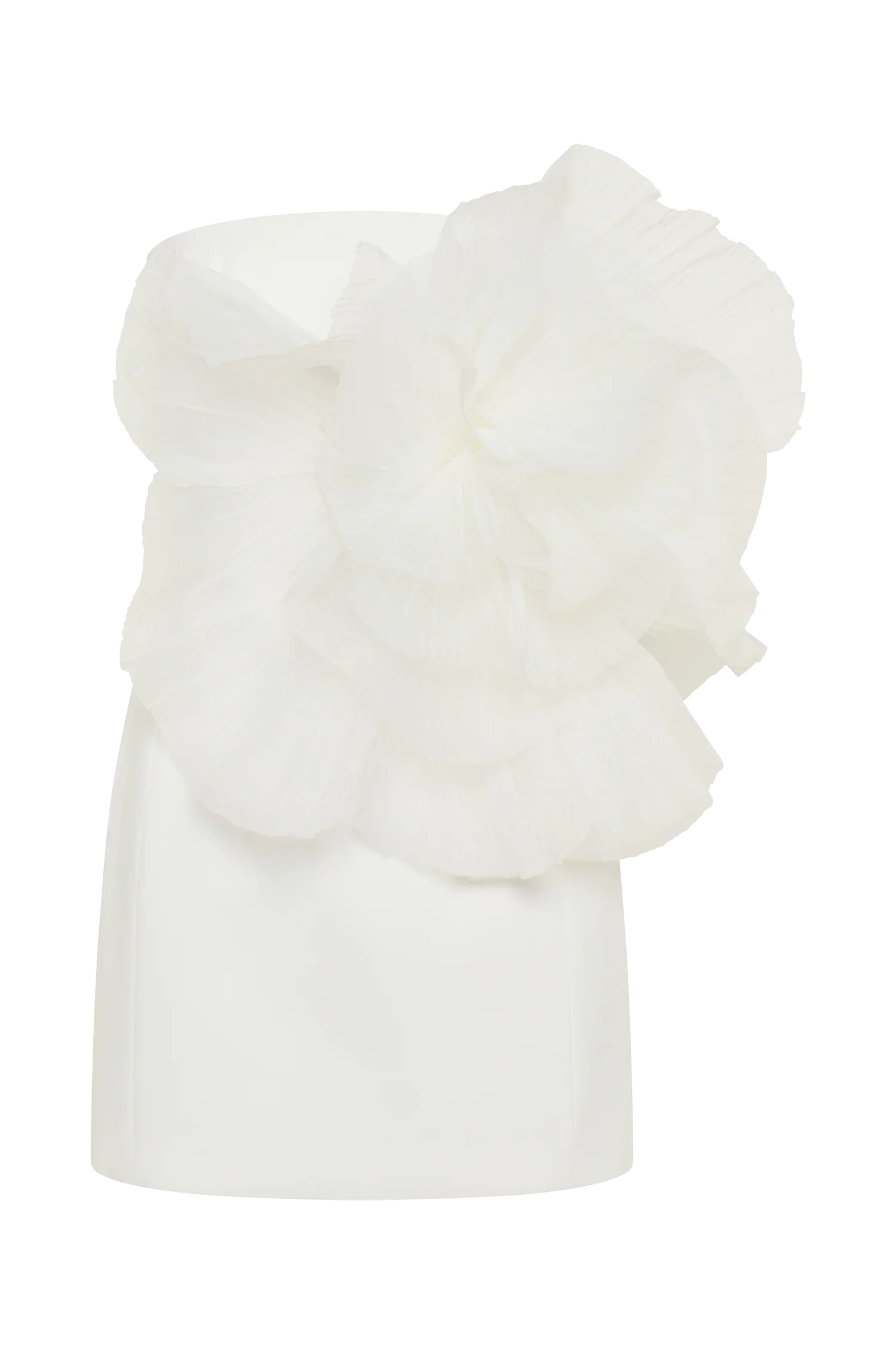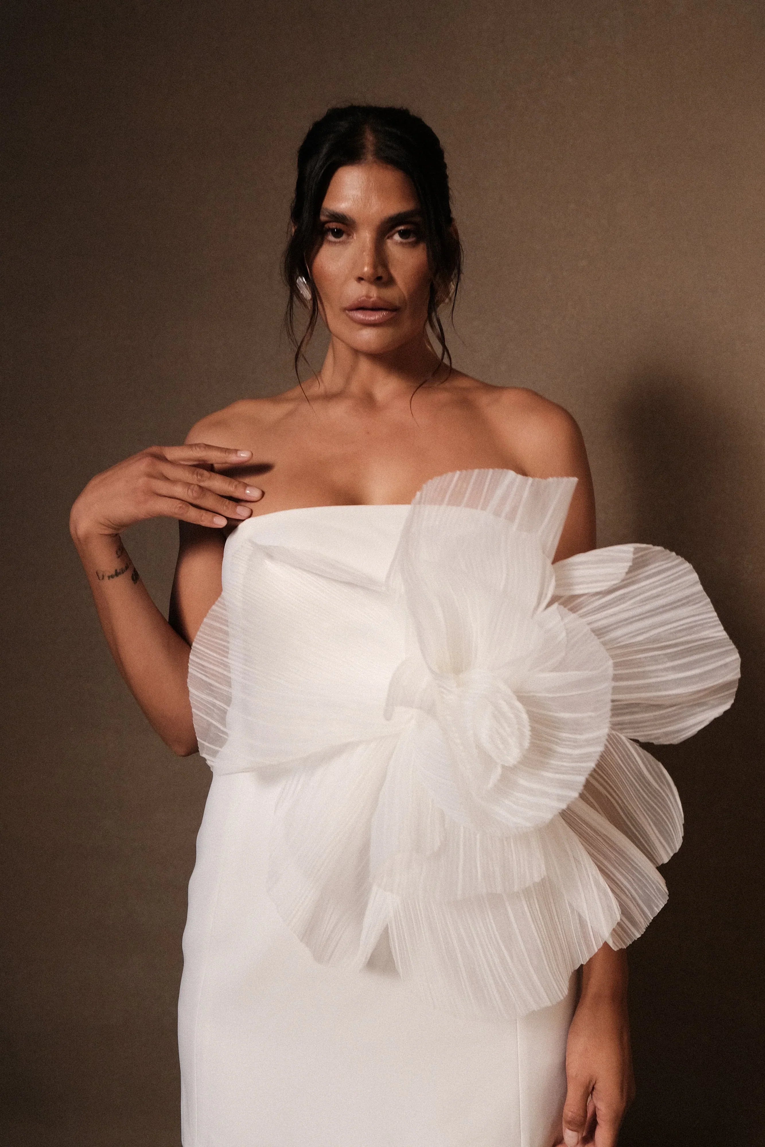 The VICTORIA Strapless Mini Dress with Oversized Flower is a captivating blend of elegance and charm. This strapless dress features an A-line silhouette that flatters every figure, while the oversized flower detail adds a bold and playful touch. Equipped with a centre back zip for easy wear and fully lined for comfort, this mini dress is perfect for making a stylish statement at any event.