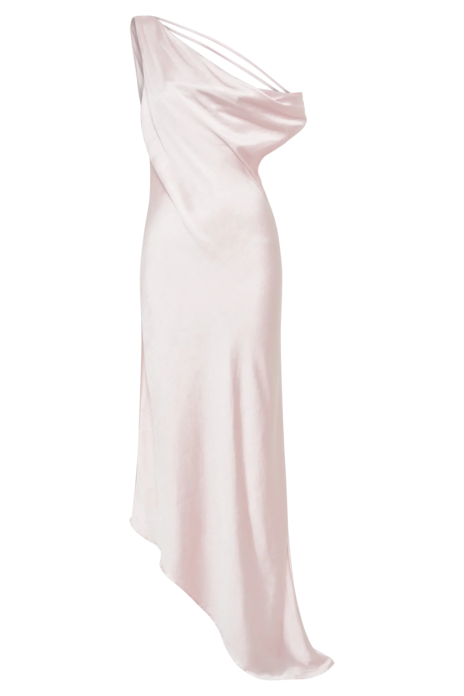 YVETTE is a Slip Maxi Dress with a low, open back, a slight cowl detail for the front neckline, and a loose, flowing hem. The front neckline dips into a slanted arrangement, with one shoulder strap up for a sleeveless look and the other down in an off-shoulder style. The asymmetrical hem is much the same, with one part gathered above the ankle and the other hitting the ground. Two thin fabric straps run across the back, adding extra detail to the low, back neckline.
